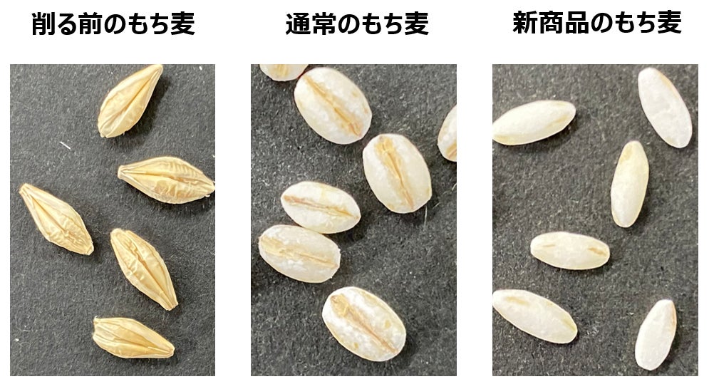 もち麦はもちもちとした特性から米のように綺麗に磨き上げようとすると、加工中の機械に強く貼り付いてしまうことや、麦が割れてしまうことからお米のように加工するのは難しいと考えられていました。
